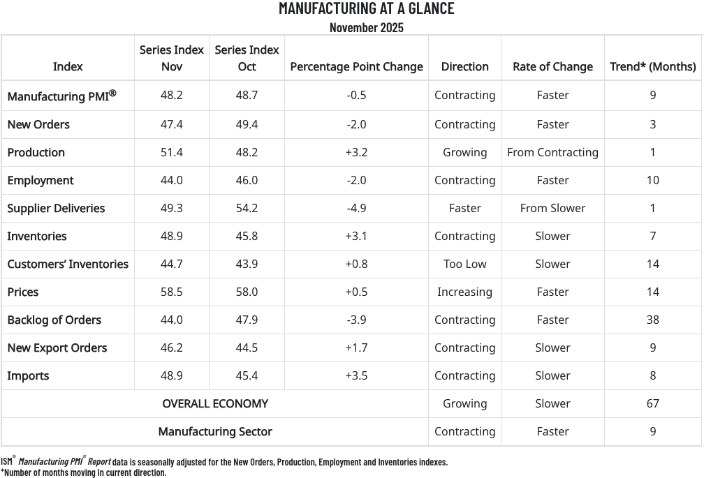“In November, U.S. manufacturing exercise contracted at a quicker fee, with pullbacks in provider deliveries, new orders and employment resulting in the 0.5-percentage level lower of the Manufacturing PMI,” commented Susan Spence, MBA, Chair of the ISM Manufacturing Enterprise Survey Committee. “ Persevering with a latest pattern, a earlier month’s enchancment in a single index was evident in one other gauge. After new orders strengthened in August, manufacturing improved in September. An enchancment within the Backlog of Orders Index in October transferred to the Manufacturing Index, which expanded in November (as backlogs pulled again). Nonetheless, the New Orders and Employment indexes each dipped 2 share factors, underscoring the continued financial uncertainty.